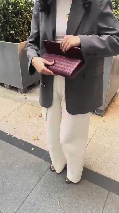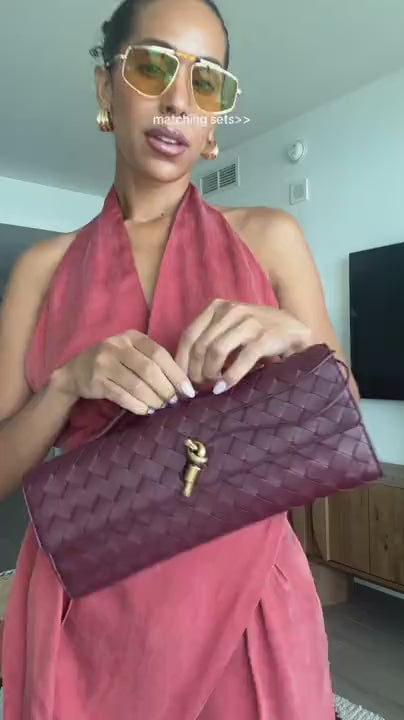 Introducing our Bianca Woven Bag, a sophisticated piece that showcases the house’s signature leather craftsmanship and meticulous attention to detail. Expertly crafted from premium vegan leather, it features a beautifully woven texture enhanced by a unique knot tie detail with a polished gold-tone toggle fastening, adding a touch of refined elegance. Its compact yet practical size is designed to fit your essentials — from your phone to a cardholder and lipstick — making it the perfect companion for events, dinners, and special occasions when you prefer to travel light. Combining timeless style with sustainable materials, the Bianca Woven Bag is a must-have accessory for the modern, eco-conscious wardrobe.