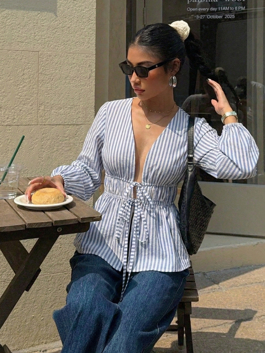 Yelena – damska bluzka w paski z wiązaniem z przodu